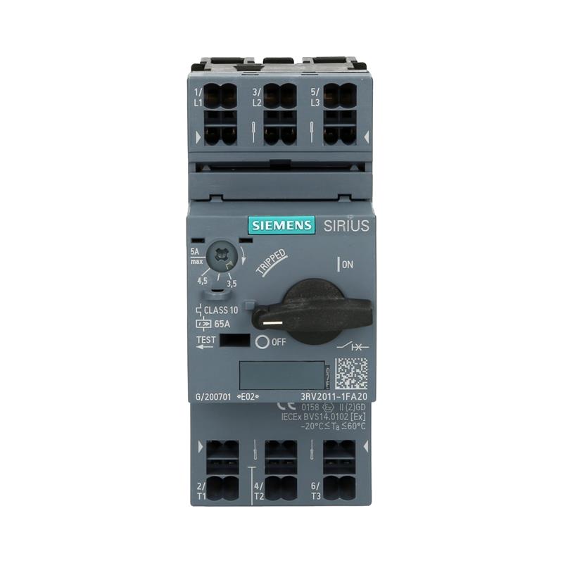 Siemens’in S00 boyutundaki SIRIUS 3RV2011-1FA20 devre kesici, AC-3/400 V’de 1,5 kW’a kadar yük besleyicileri için kompakt bir akım sınırlamalı devre kesicidir. 65 A ve 3,5–5 A ayarlanabilir aşırı yük korumasına sahip 3RV2011-1FA20 devre kesici, motorları korumak için idealdir.