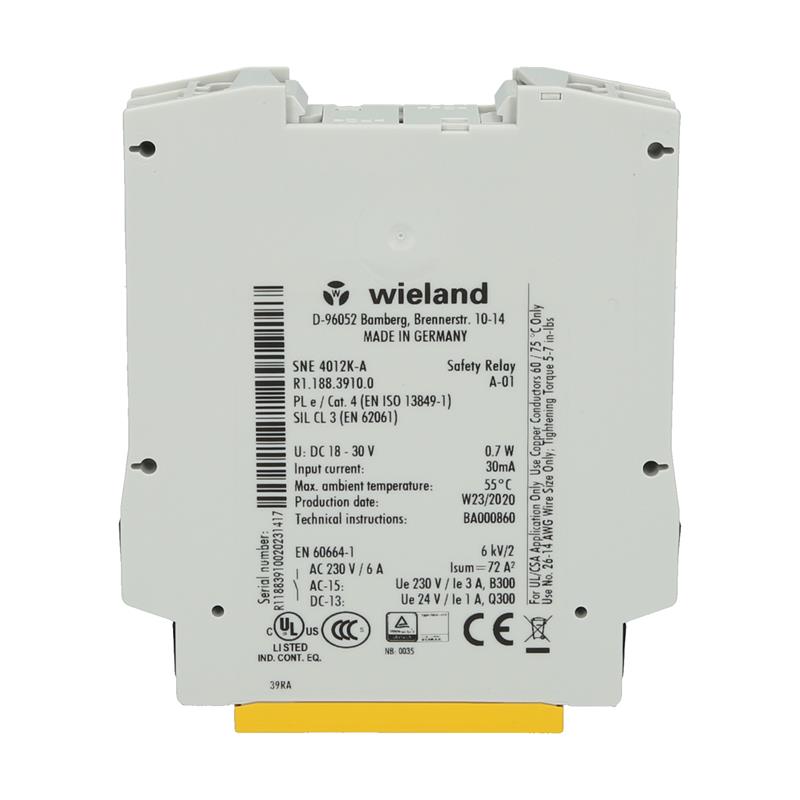 Wieland’ın R1.188.3910.0 – SNE4012K-A AC/DC 24V (A) kontak genişletme modülü, çıkış genişletme için kullanılır Güvenlikle ilgili devrelerin izlenmesi için güvenlik röleleri. Akım yollarını etkinleştiren iki açık kontağın yanı sıra bir yardımcı kontağa sahiptir. 24 V AC/DC besleme voltajına sahip R1.188.3910.0 – SNE4012K-A AC/DC 24V (A) kontak genişletmesi, geçmeli vidalı terminaller aracılığıyla bağlanır ve bir DIN35 rayına monte edilebilir.