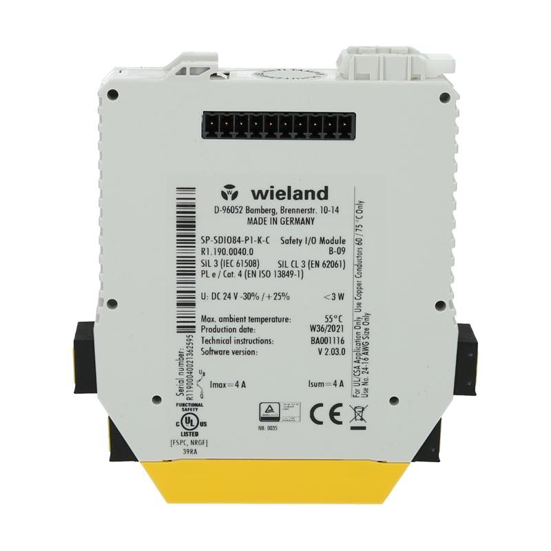 Wieland’ın R1.190.0040.0 – SP-SDIO84-P1-KC DC 24V Dijital Giriş/Çıkış Modülü sekiz güvenli dijitale sahiptir girişler, dört güvenli dijital çıkış (transistör) ve 24 V DC besleme voltajıyla giriş sinyallerini işler. Takılabilir vidalı terminaller aracılığıyla bağlanır ve DIN 35 rayına monte edilir. Giriş ve çıkış modülü R1.190.0040.0 – SP-SDIO84-P1-KC DC 24V’nin olası uygulama alanları arasında makine mühendisliği, presler, ateşleme tesisleri veya şirket içi lojistik yer alır.