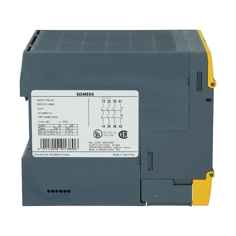 Siemens’in SIRIUS 3SK1213-1AB40 3RO Power kontak genişletmesi, emniyet rölelerinin çıkış sayısını artırmak için kullanılır. Akım yollarını etkinleştirmek için üç NO kontağı ve bir yardımcı kontağı vardır. 24 V DC besleme gerilimine sahip SIRIUS 3SK1213-1AB40 3RO Güç kontağı genişletme ünitesi, vidalı terminaller aracılığıyla bağlanır ve bir DIN35 rayına monte edilebilir.